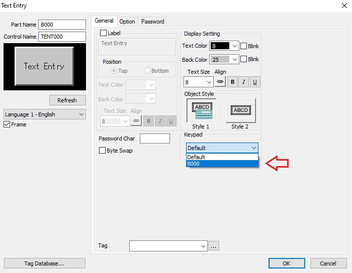 10.Paste the “Text entry” component on the screen, open the properties screen, and change “keybord” from “Default” to “B000”, a keyboard with “-” will be displayed.