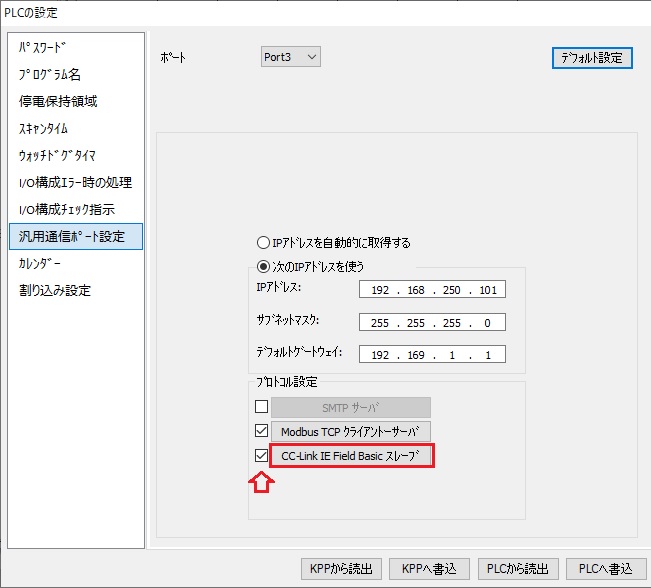 ①KPP:Kostac PLC Programming softwareの「PLC」→「PLC設定」→「汎用通信ポート設定」のPort3にて、SJ-EtherのIPアドレス、サブネットマスク(255.255.255.0)を設定。